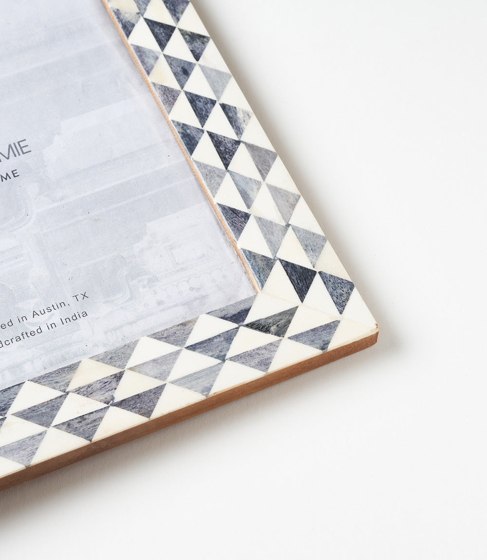 Our Varuna Collection incorporates traditional Indian art forms in modern, sea-inspired designs handcrafted from ethically sourced bone tile. Master artisans in Old Delhi skillfully assemble elements to create unique, eye-catching mosaic designs. This handcrafted photo frame is thoughtfully designed for stylish display with a triangle wave design in gray. For convenient display this picture frame features a two-way table top easel and d-ring for hanging. Frame accommodates 8x10 photo or print, easily accessed with metal swivel tabs and access removable back.