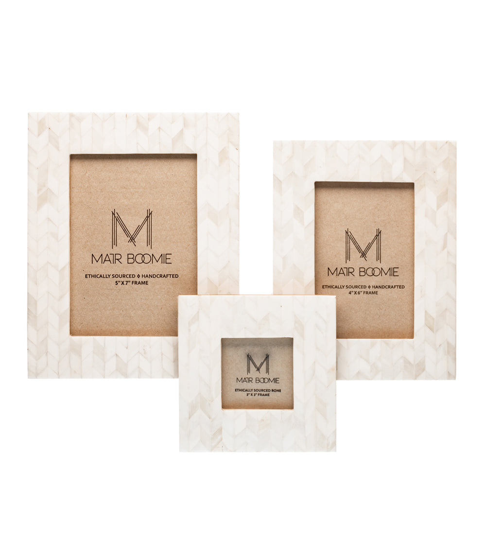 Display your most treasured memories in this photo frame made of cruelty-free, ethically sourced bone in a mosaic chevron pattern inlay. For convenient display this picture frame features a two-way table top easel and two d-rings for hanging. Frame accommodates 5x7 photo or print, easily accessed with metal swivel tabs and access removable back.